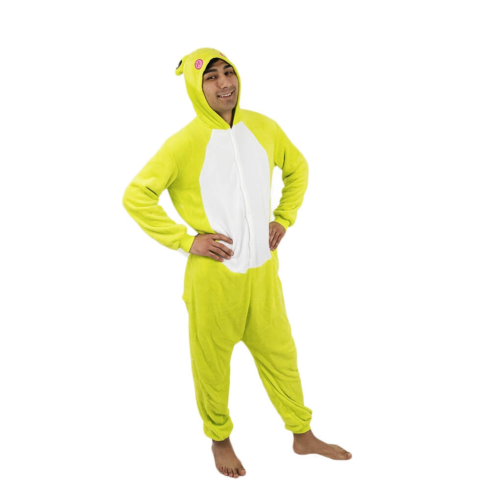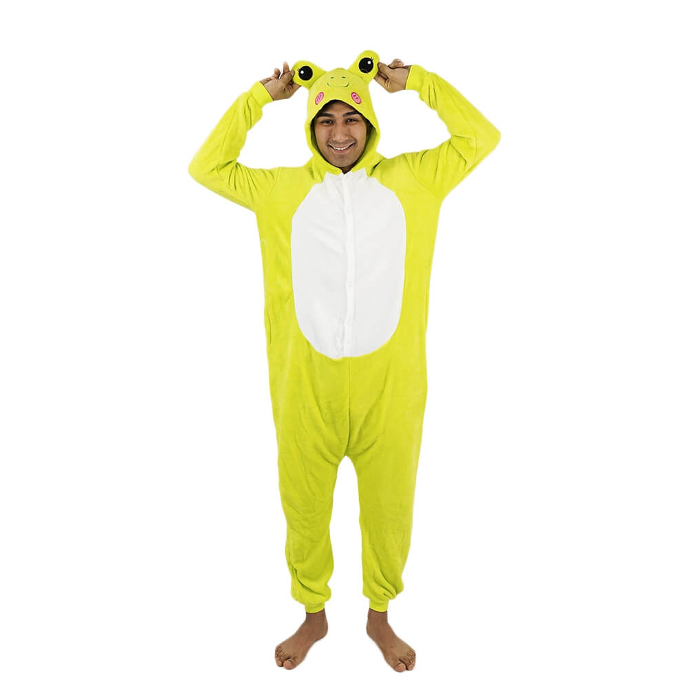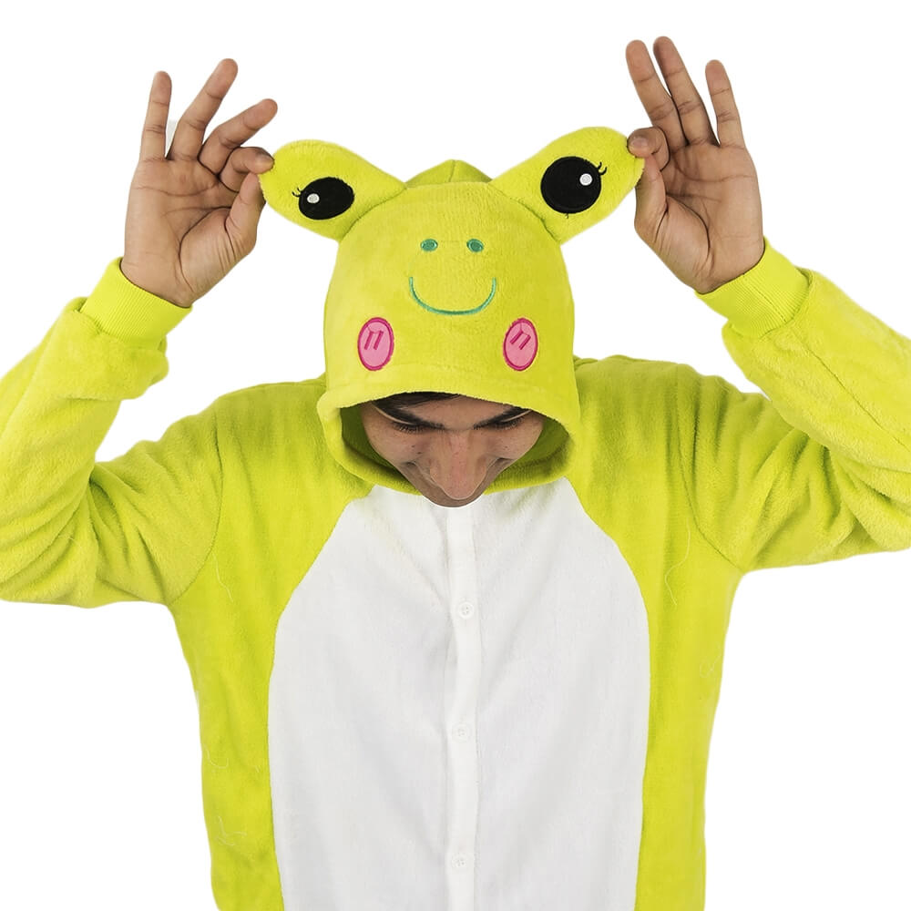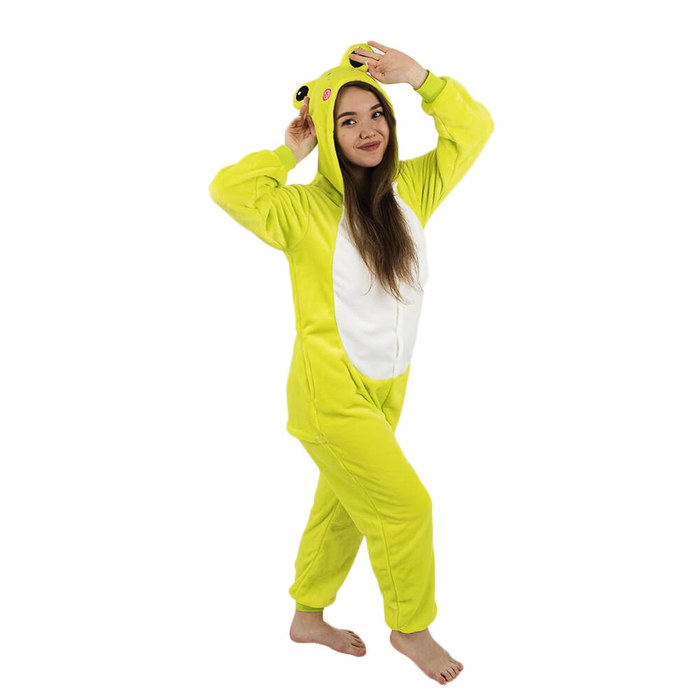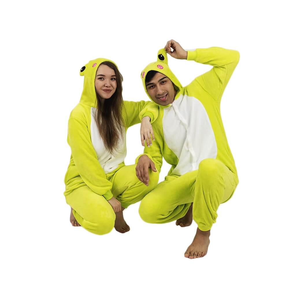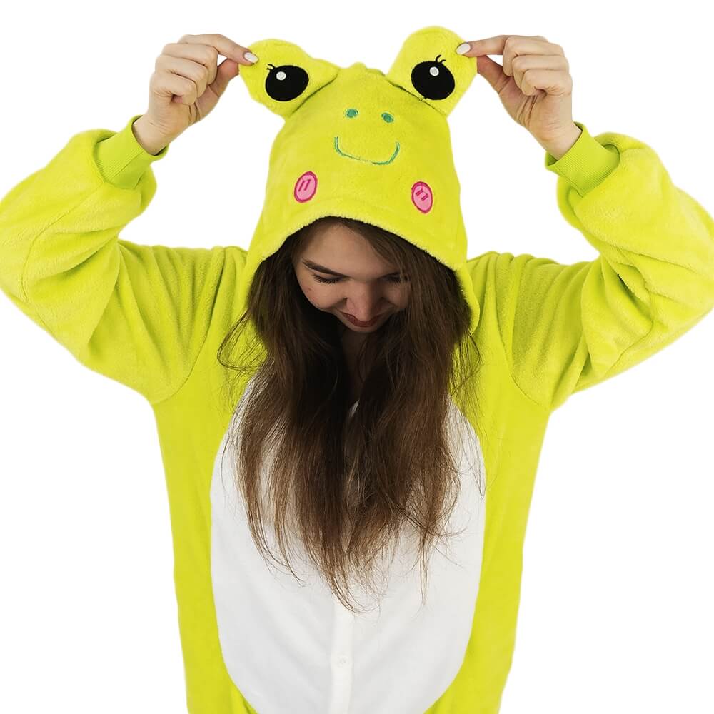 У этой модели кигуруми яркий дизайн, который подойдет и мужчине, и женщине. Модель сшита из мягкой и приятной на ощупь ткани, за которой легко ухаживать. Она выдерживает машинную стирку, не мнется, имеет небольшую эластичность. Крой продуман до мелочей: широкие штанины и рукава, застежка не только впереди, но и сзади, боковые карманы. На капюшоне изображена мордочка лягушонка.