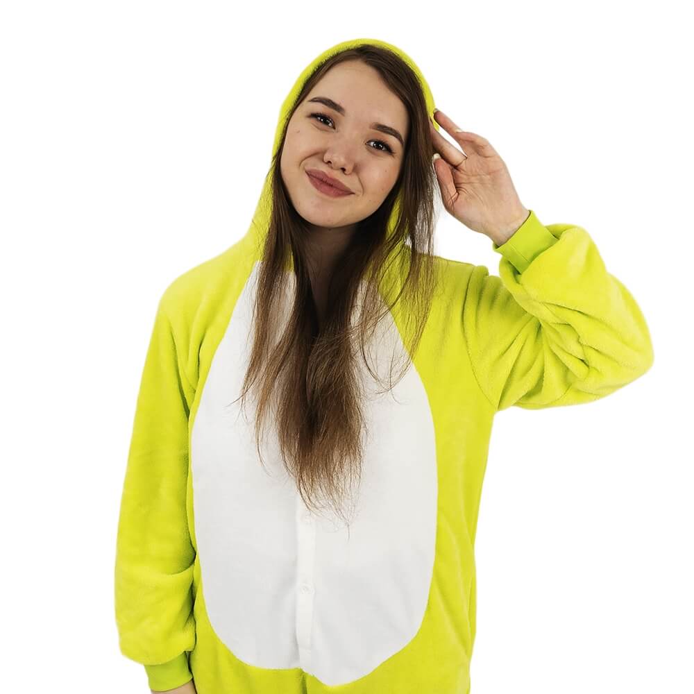 Кигуруми сочного желто-зеленого цвета поднимет настроение и создаст атмосферу веселья и праздника. Его можно надевать на вечеринку или костюмированный праздник, использовать как домашнюю одежду. Просторный крой не сковывает движения, дарит свободу. В нем удобно танцевать, прыгать, лежать на диване в любых позах.